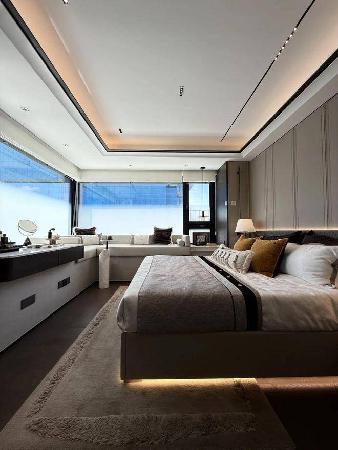 120㎡三房:动静分离设计,三开间朝南,配备6个飘窗增强采光,主卧含独立衣帽间、梳妆台及美妆冰箱。