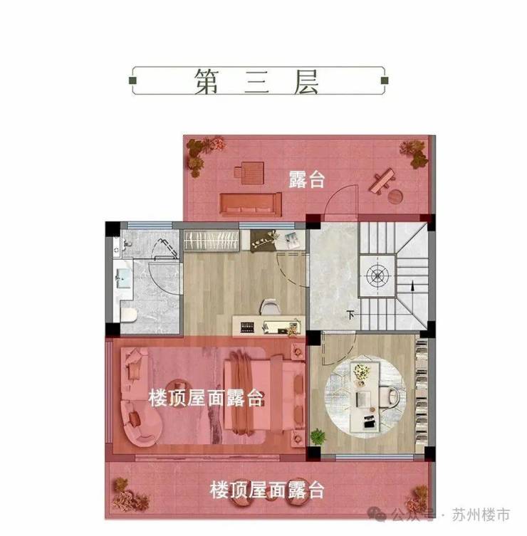 三层,整层套房设计。该层赠送约23㎡的南北双向大露台,这里作为建筑的“空中延伸空间”,兼具视野开阔、采光充足的优势,无论是打造成亲近自然的露台卧室,还是多功能的生活场域,都能极大提升居住体验。