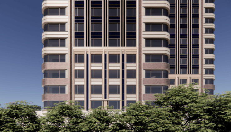 住宅建筑立面由砖红铝板搭配柔美圆弧形结构,竖向线条清晰挺拔,层层递进的装饰主义,回应着上海传统住宅的特质,将建筑向上引领,勾勒出独特的住宅体态。