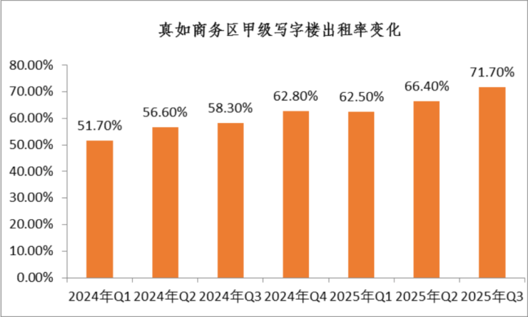 真如的产业规模十分扎实。公开数据显示,2024年,中海中心跃居上海写字楼年度租赁市场成交榜首。真如商务区甲级写字楼出租率也一路攀升——从2024年一季度的51.7%,提升至2025年三季度的71.7%。
