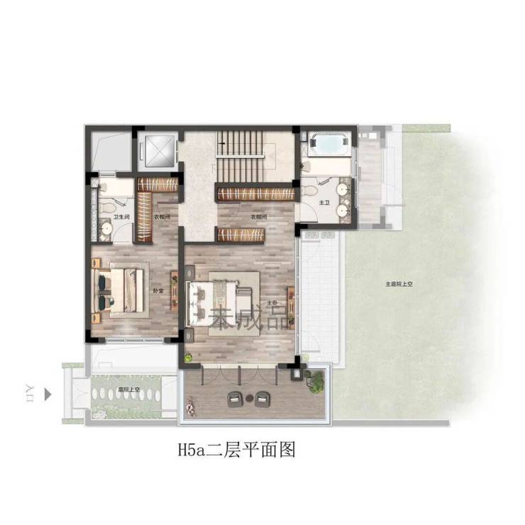 二层双卧朝南,主卧尺度奢阔,起居室→衣帽间→卫浴间层层递进。较一期新增的地上楼层露台设计,更延伸了室内的使用空间。