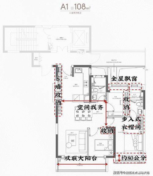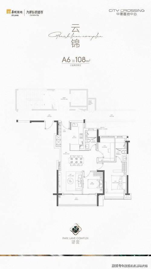 建面约108㎡三房:横厅设计,三开间朝南,带大阳台,总价约700万级,适合年轻改善家庭;