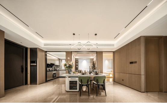 以鱼肚金岩板背景、爱马仕灰不锈钢与内嵌灯带,塑造出光影流转的艺术空间,归家如同步入精品酒店。