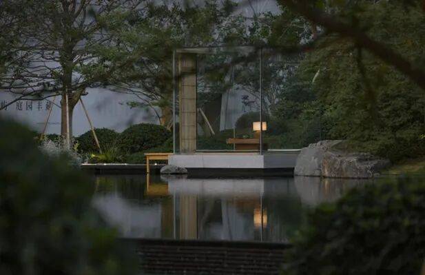 如果小胖没有记错的话,这应该是今年全杭州排面最大的楼盘前场。玩石、叠水、绿植、艺术雕塑高低错落分布,还有一面叠瀑从建筑立面里垂延出来。