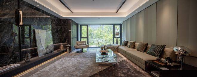 3、高端的爱马仕灰奢石打造的景墙,转角弧面犹如犹如翡翠赌石,优雅贵气。