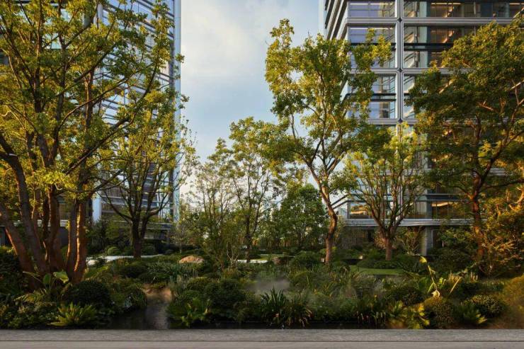 走入T-ONE潮博西区的园区,可以看到一条蜿蜒的水系串联着不同场景,贯穿整个楼盘。在这里,Pok是结合了杭州「钱塘江潮」的在地文化,用溪流与叠水打造出了一座很有度假感的花园。花园中,凡是有户外座椅的地方,就会有微风、树荫与水流的环绕。