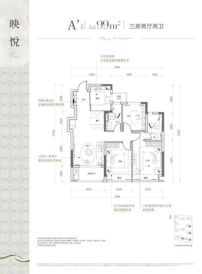 建筑面积约99平方米的舒适三居,匠心独运动静分区设计,三开间朝南布局,配备双飘窗与宽敞阳台,尽享室内通风采光之宜。