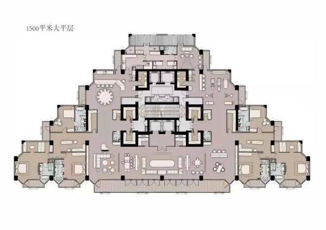 主力面积为370、750、1500㎡三个面积段,即半层、一层、半层复式、整层复式几种,南侧一栋住宅户型呈金字塔造型,四间套房,超大客餐厅,充分利用南向面宽,360°采光不浪费一丝一毫江景。