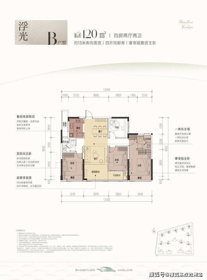 这款户型堪称四开间朝南的“流量王者”,南向面宽约13米,双联阳台+双飘窗设计,视野和采光优秀;套房主卧、双阳光次卧,颇有大平层的气势。