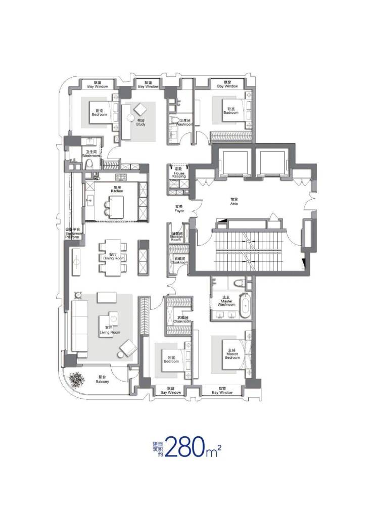 280㎡4+X房:内环内·大师定制艺术·全功能性奢宅;边套270度舒适采光,超大舒适厨房,五房空间尺度、可根据自身需求调整功能;3700-4000万,尊崇功能五房,满足现有市场多孩客户需求,可随时更改室内功能性;客阳台一体,边套270°舒适采光;