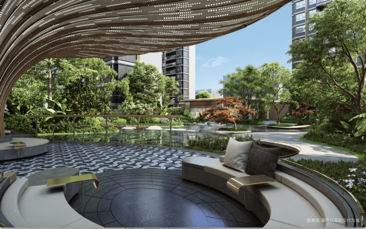 社区景观上,秉承“内外双公园、城市公园一体化”理念,打造出“一轴、一带、一环、九大花园空间”的生态品质社区。