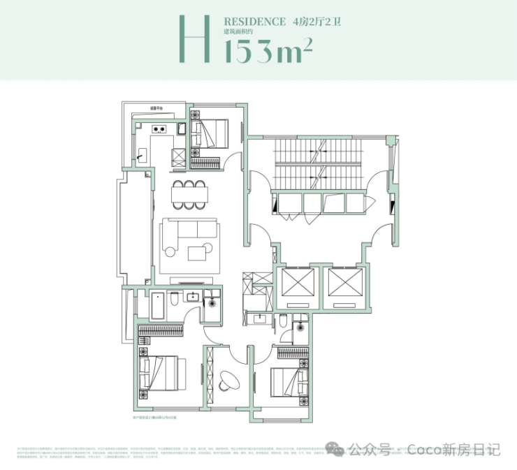 该户型是经典的四叶草布局,四开间分布在四角,兼顾私密与互动,是二胎家庭的优选;
