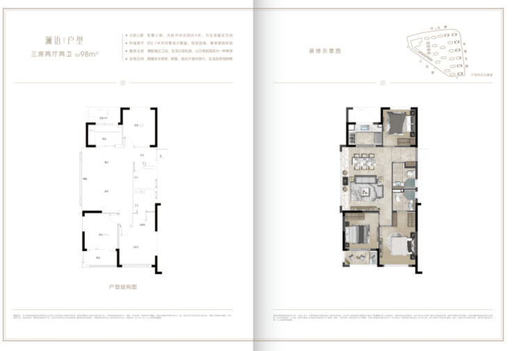 约98㎡边套,拥有约5.7米宽的餐客一体化纵向大边厅。朝南次卧面宽也有约3米,为生活留足空间,户型和118方类似。