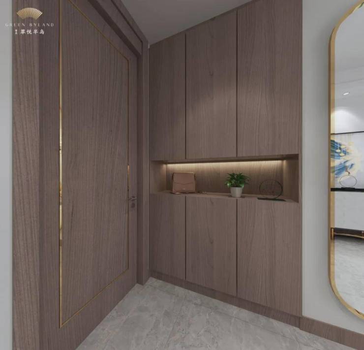 而入户玄关柜,采用了三段式玄关柜设计,上中下各设收纳分区,保持了整个空间私密性的同时,在空间使用率上又做到了合理分配。上层收纳区可用于收纳使用频率不高的家居或换季鞋服;中层物件区悬空并设置了内打灯,可摆放观赏性摆件/家庭相簿、钥匙等小物件,温馨十足;下层常用区可收纳常用鞋、拖鞋等,空间大,可满足全家鞋子收纳需求。