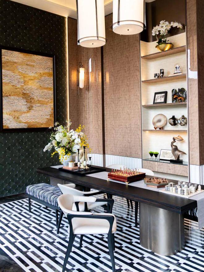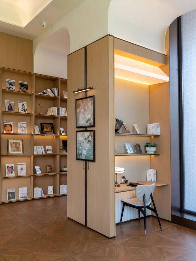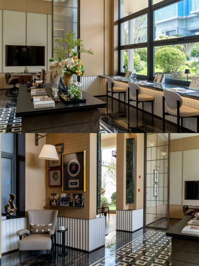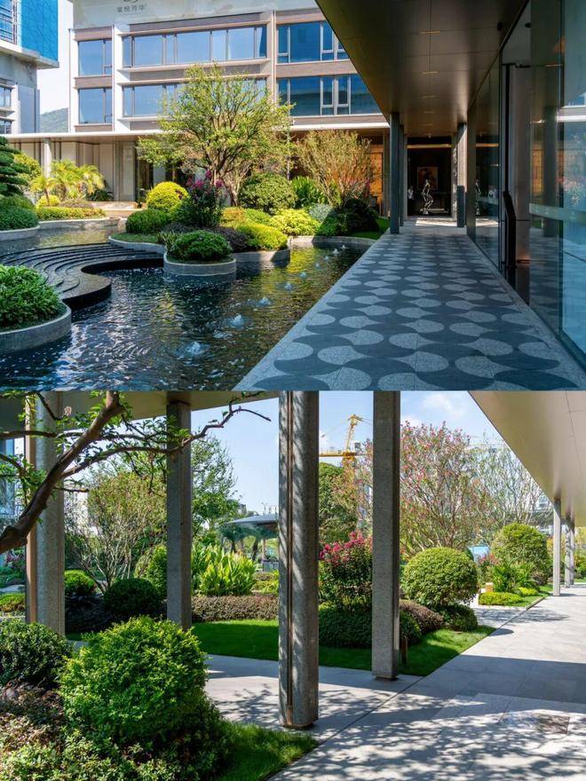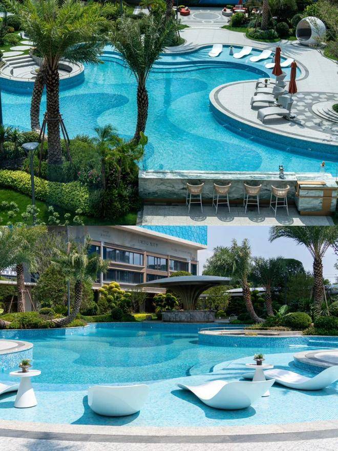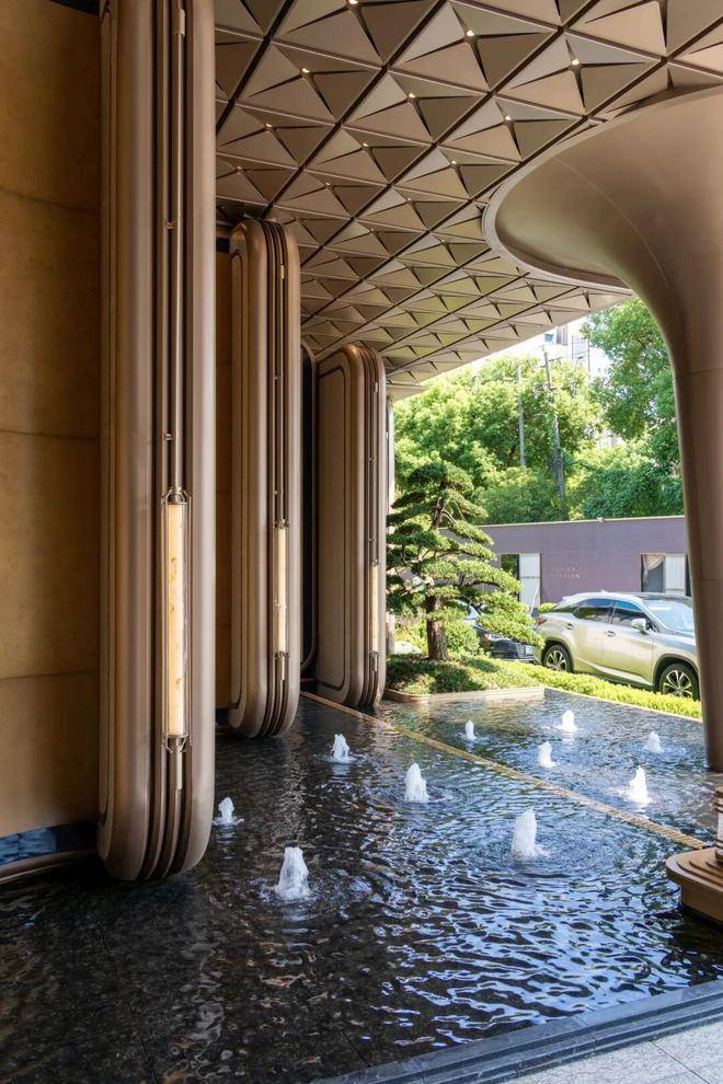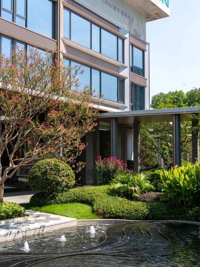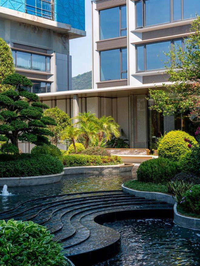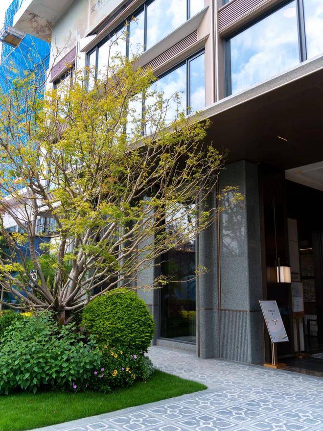 园林设计灵感源自珠宝品牌CHAUMET,以“繁花造型珠宝”为理念,设计了“一轴、一带、两芯、八境”的景观结构,包含了迎宾水院、戏水池、特色苗木和休闲卡座等,旨在营造度假般的园林体验。
