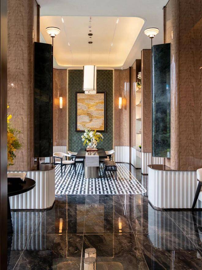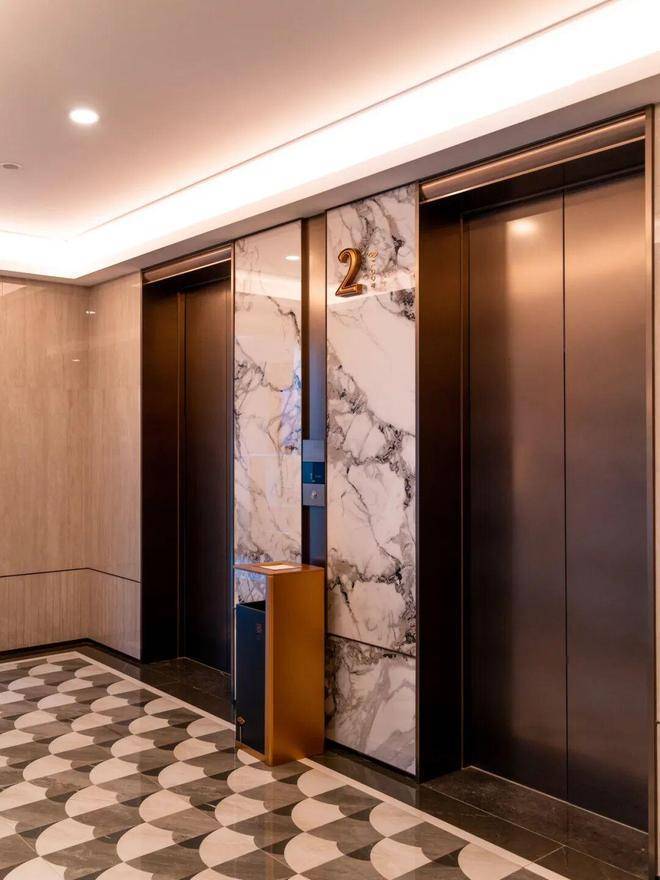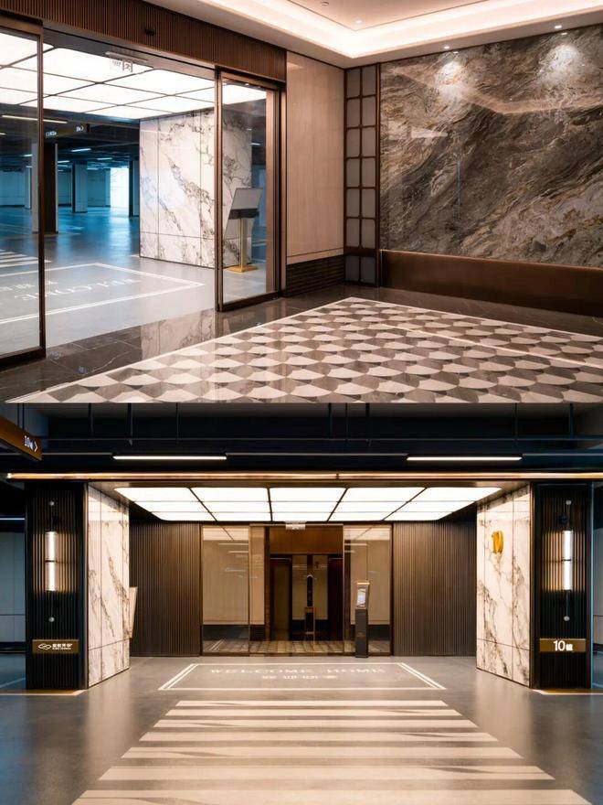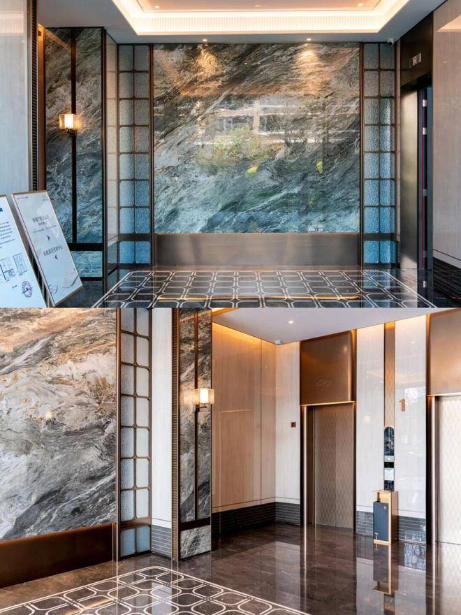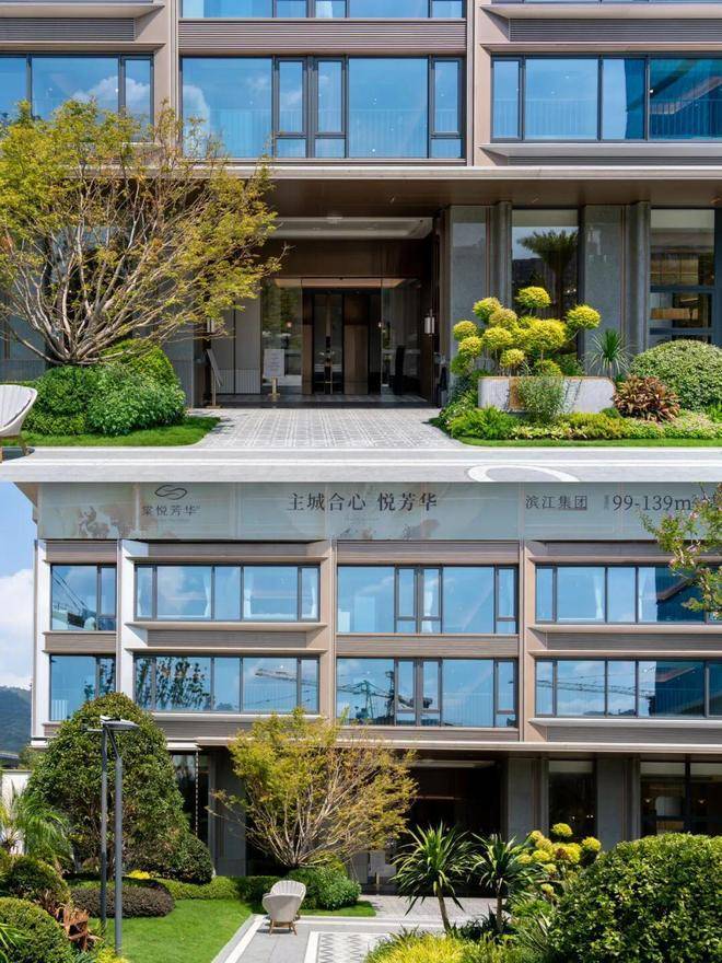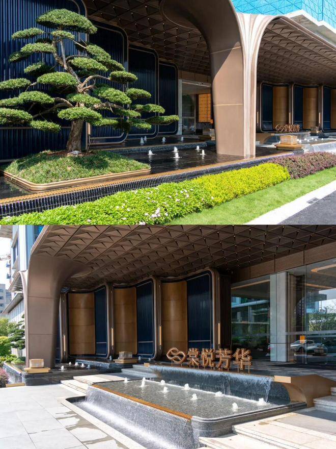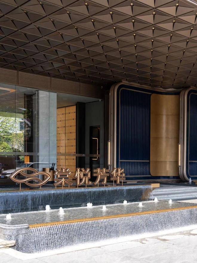 滨江棠悦芳华轩小区的归家大门设计注重仪式感和归家体验,采用了星级酒店的设计标准,运用了精细拉槽的石材、仿铜不锈钢以及宝石蓝釉面陶板等材料,旨在营造大气开阔的入口形象。