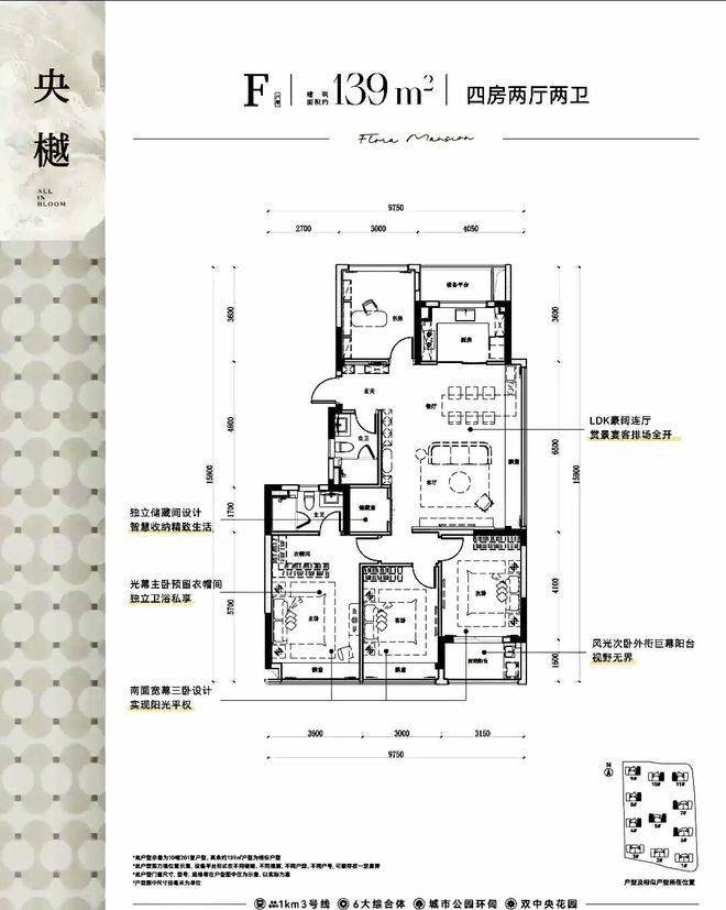 户型覆盖建面约99-139㎡的三房和四房。例如约99㎡的三房两卫户型做到了三开间朝南;约139㎡的四房两卫户型则设计了南向三卧室和双飘窗。