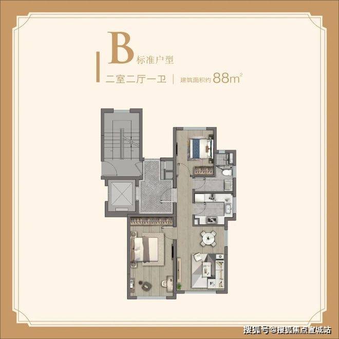 所以,该户型即使中间套都是真南北通透,三个房间分列客餐厅两侧,互不打扰;类一梯一户也是标配。