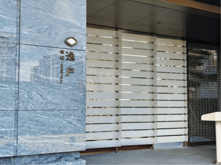 首先是小区南侧的次入口,进门第一个最吸引人的地方就是玉石照壁,75片珍贵的玉石用金属拼接起来,寓意着「金玉满堂」。