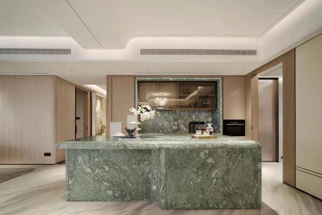 主卧的锤纹门把手、地板花瓣拼、镂花的空调出风口每一个都是世界级的工艺。同样,精装的用材也很考究,从电梯厅到室内各种奢材在这里齐聚,瑞士翡翠、白雪公主、蒂芙尼绿、巴黎金等奢石,还有仿锤纹夹丝玻璃、仿古锈镜、隐木这些罕见用材增添艺术质感。