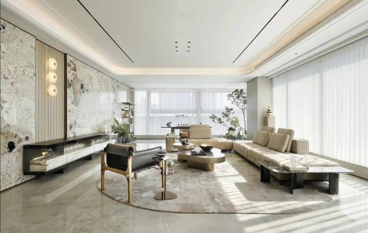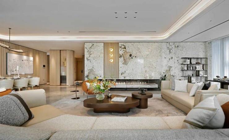 东区建面约320户型,将艺术感进一步融入日常中。特别设计的专属门厅空间,是从电梯厅延伸到家,如同一处艺廊,放慢人的情绪;室内选用了浅金色奢石(外界也称其为“芬迪白大理石”)作为主要的石材,曲面的木饰面也为浅色,整体给人以明亮感。