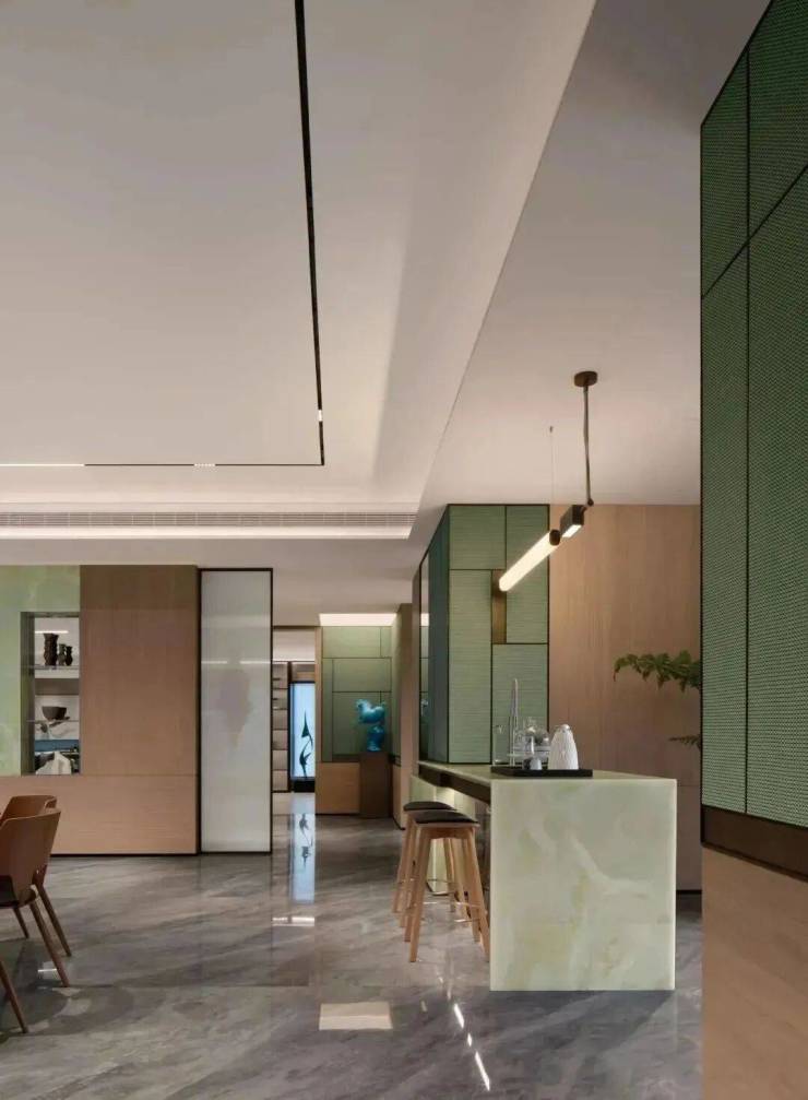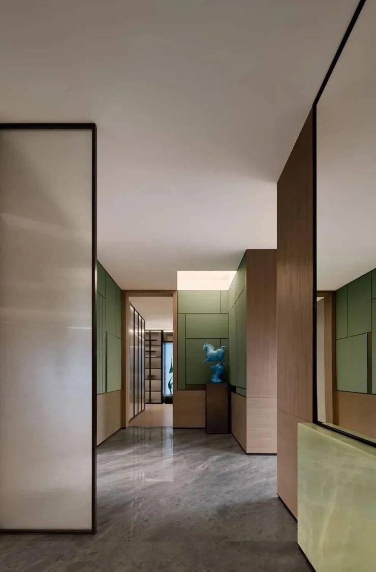 户型格局上,基本做成了类一梯一户格局,一层两户两部电梯,彼此都拥有独立的入户门厅。进门是大空间玄关区,与之搭配的辅料,有皮革、山水纹理大理石、瓦楞玻璃、仿古铜金属等,时而明澈,时而苍劲。米白色石材和温润的木质面犹如一个盛在东方意蕴的艺术品。