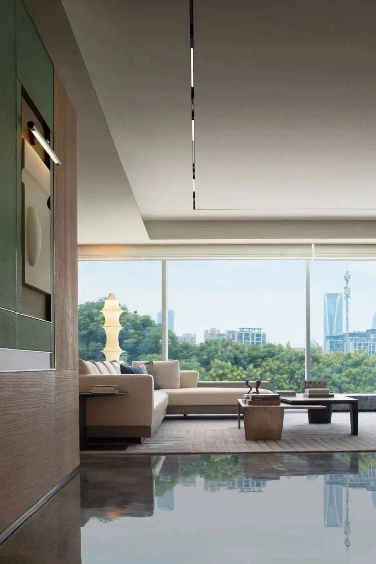 而李嘉诚御用设计师梁景华的390m²正厅,电视背景墙是意大利潘多拉奢石,甚至延伸到了空中花园,电动开启扇也是大平层中极为稀缺的,当窗户徐徐移下,正好就成了一道玻璃栏杆,变成开敞式空中花园。单单是这扇窗户,就快顶得上一辆特斯拉,而潮博奢侈的用了2辆。