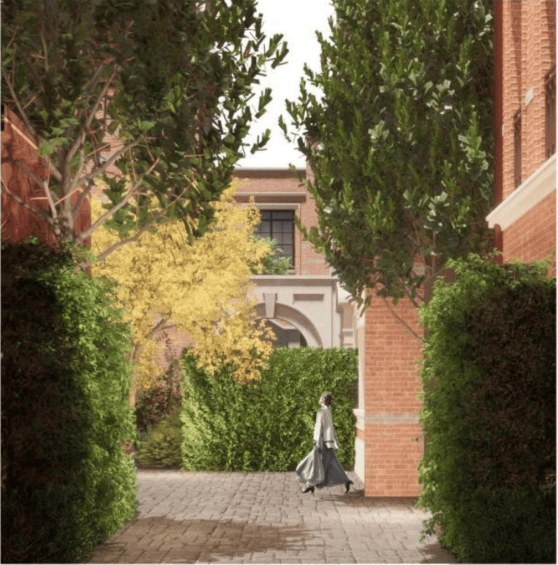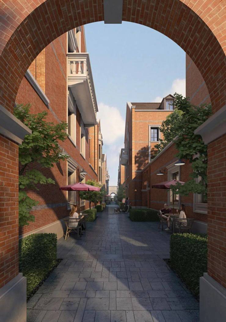 风貌里弄浓缩了中西合璧的石库门文化,采用原汁原味的红色陶砖镶嵌灰砖再现传统墙面。巷道尺度关系亲密而不拥挤,承载着海派生活的高级烟火气。
