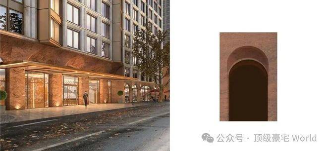 在高层的底层商业部分,项目选用了来自巴西的奢石波多尔红,搭配高难度的双曲面工艺,呈现出独特的优雅与魅力。商业以上的建筑立面,用巴西进口玫瑰金麻造型石材搭配局部铝板及金属线条,强化了现代感,传递出新旧交融的气质。