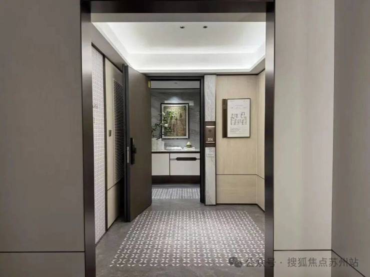 玄关处地面菱形拼花与电梯前室地面相呼应,不仅使空间更加富有层次,同时营造专属的入户尊崇感。