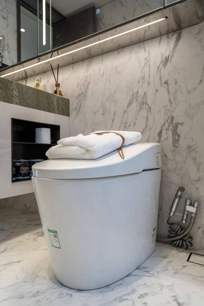 大牌智能化马桶,旁边的喷枪配置、预留隐藏收纳空间,都是交付标准。