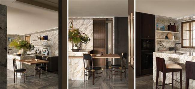 皇家白奢石、Prada绿皮革面奢石、砖纹定制铝板... 细节中透露出精致与考究。工艺工法间对72种奢材的展示,让人心悦诚服。