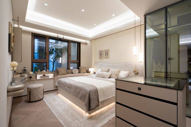 主卧更做到约3.4米净面宽,空间充裕到可以在床尾额外增设衣柜。