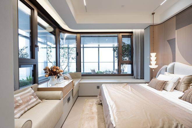 更具实用性的是,阳台采用下半部分固定、上半部分平移开启的窗型设计,兼顾观景视野与通风需求。