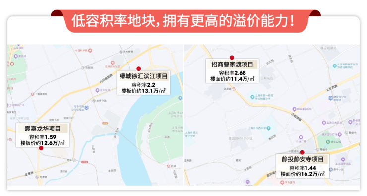 宸嘉龙华项目,容积率1.59,可售住宅楼板价约12.6万/㎡,楼板价直逼徐汇滨江的绿城项目;静投静安寺项目,容积率1.44,可售住宅楼板价约16.2万/㎡,楼板价远超曹家渡的招商项目不难发现,低密地块拥有非常强劲的溢价能力!