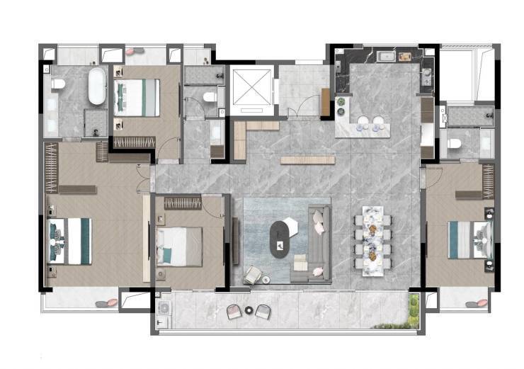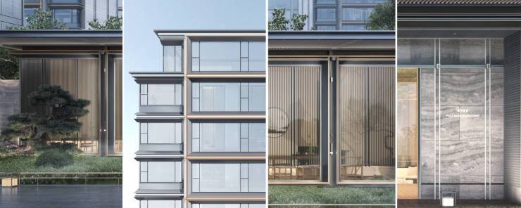 高级灰铝板、仿胡桃木色铝板、漫反射白玻、深灰色大理石材,多样化模块组合,打造低饱和度色彩与精致材料搭配