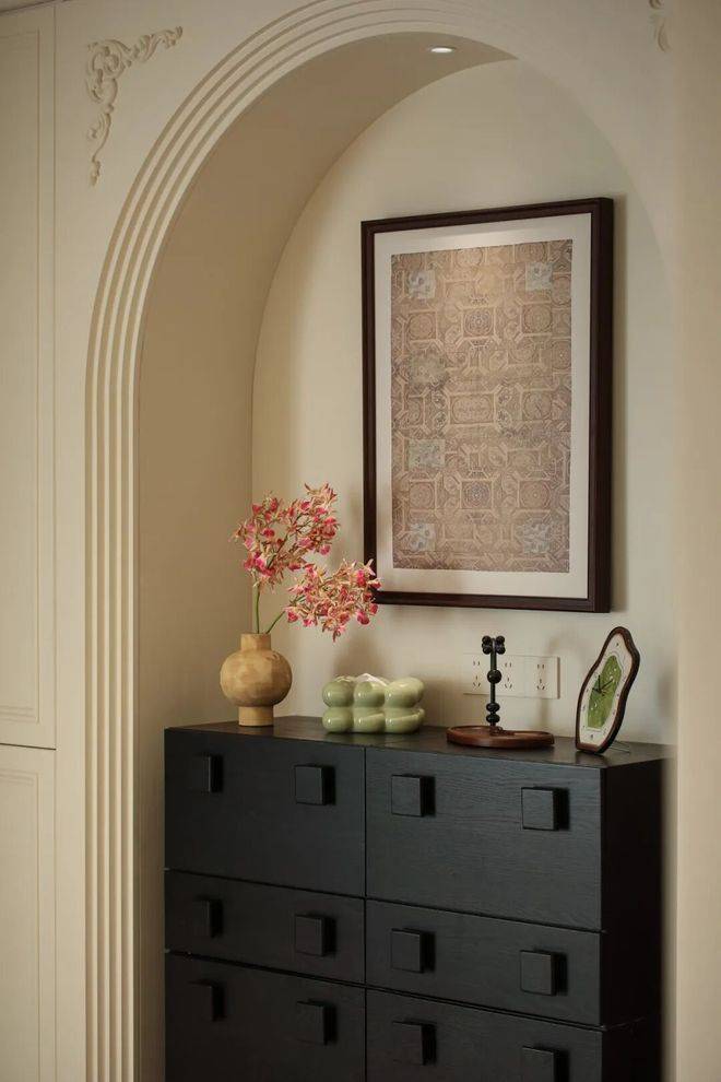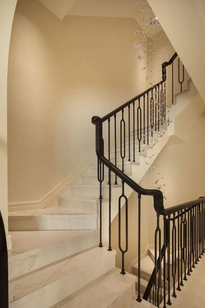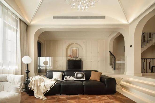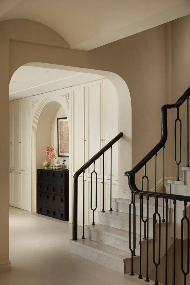 楼梯区域的黑色铁艺栏杆+弧形台阶设计,成为空间的点睛之笔,既保障安全,又延续法式的精致线条,上下楼梯的每一步,都仿佛行走在法式生活的画卷中。
