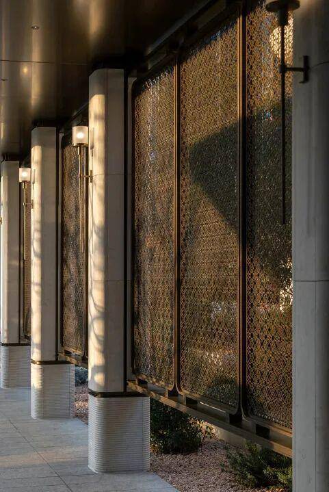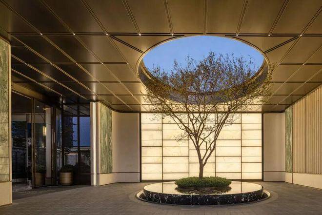 社区主入口是超宽幅门头,宽约 80m 高约 7.1m,两侧的维多利亚绿奢石以及中央的白雪公主透光石很吸睛,浅色的部分则是贝金米黄石材,圆弧的工艺处理也更显温润及价值感,中央栽植的超大紫薇树拥有约60年树龄,底部则是采用宝格丽黑奢石作为基座。