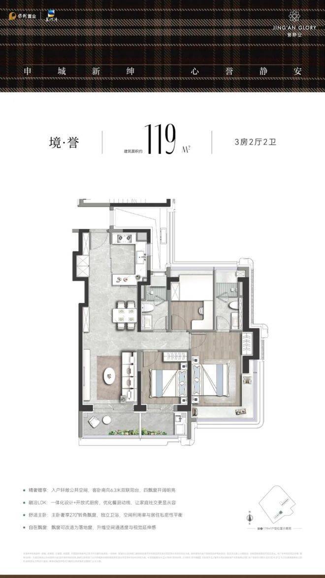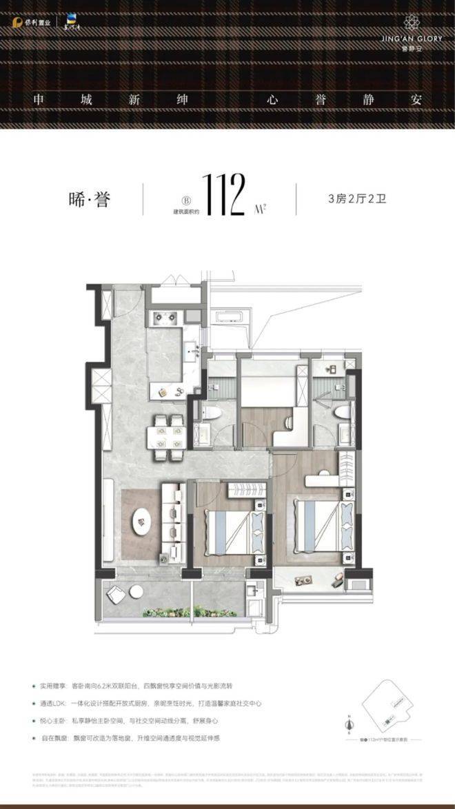 其中建面约112-119㎡高拓三房配备美诺四件套厨电、门面奢石定制等品质精工,