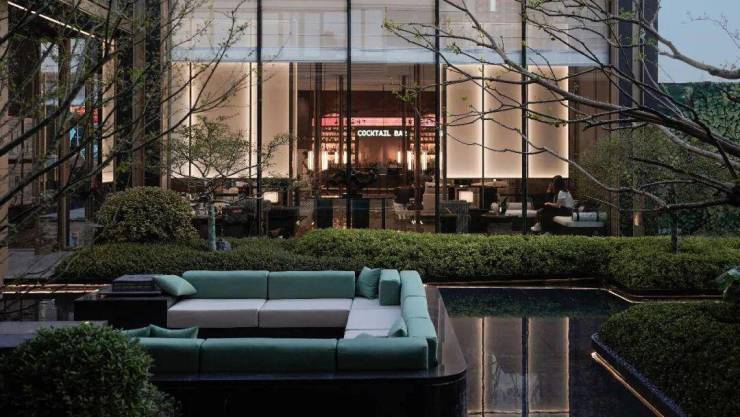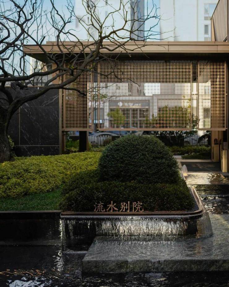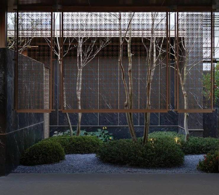 迎宾庭院拾级而上,第一眼便能看见藏于帘后的精选造型乔木斜卧与水面之上,将动静的行进模式注入场景本身。