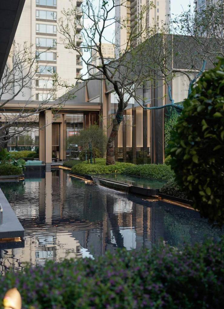 平静的水面忽而泛起涟漪,约 20 年树龄的丛生乌桕,秋日飘下一抹绯红。苍翠的特选树木、静谧私享的庭院,雅致的水中莲花,共同构建社区超级客厅。