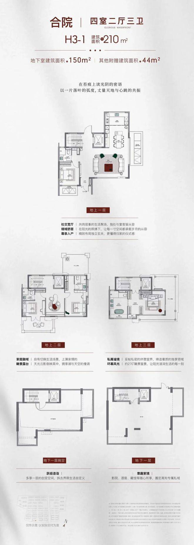 建面约 170㎡双拼别墅:6+1 房灵动格局,实际使用面积约 330㎡,附赠 70-120㎡私家花园与水岸空间,一楼层高 4.5 米,其他楼层层高 3.6 米,全明套房设计,满足三代同堂舒适居住。