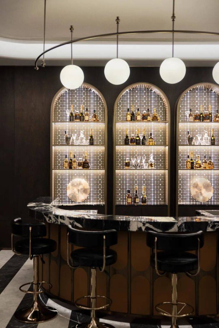 在这方酒吧天地,深色墙域如静谧幕布,弧形吧台似优雅请柬。入座吧台,于明暗交织里,任微醺漫上舌尖,开启独属于夜晚的奢雅沉醉 。