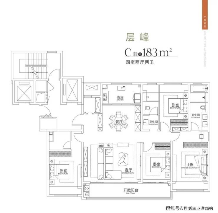 183户型为2梯2户设计,做了4房2厅3卫,含2个套房。户型方正,没有空间浪费;四开间朝南,南向面宽达16.3米,客厅开间6米,阳台宽9米;入户有玄关,预留了家政间空间;餐厨区南北向连,与客厅保持恰当的距离;主卧套房面积约32.6㎡,卫生间含双台盆、淋浴和浴缸;次卧套房面积也不小,但是为暗卫。