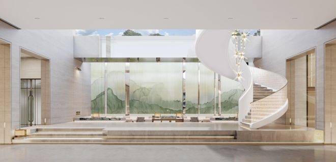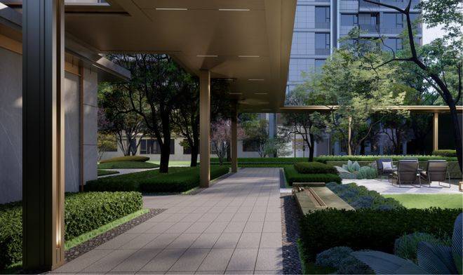 步入庭院,精致会客厅搭配匆匆绿意和层叠水院,颇具层次感的美景让归家的业主瞬间放松,卸下一天的疲惫,也深度诠释了项目归家即是度假开始的设计理念!