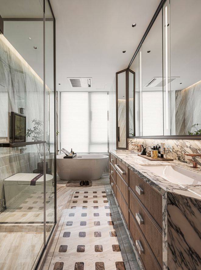 205方的由意大利设计师Andrea Bonini亲自操刀,紫山水石材从踢脚线攀升,直到客厅吊顶,在嵌入式灯带的烘托下,如月光般柔和,与温润的木饰面形成层次和谐的反差。