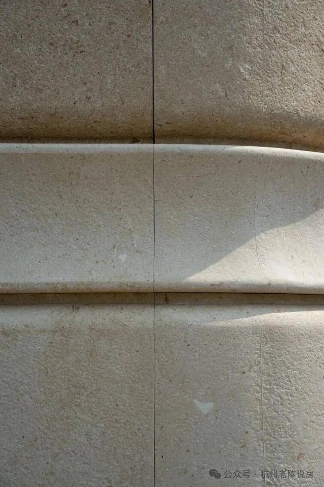两侧立面采用横向肌理,材料选用贝金米黄石,形成流动的视觉节奏,象征时间的延续与城市的脉动。细部的月牙弧线处理,呼应西湖水波的柔美韵律。