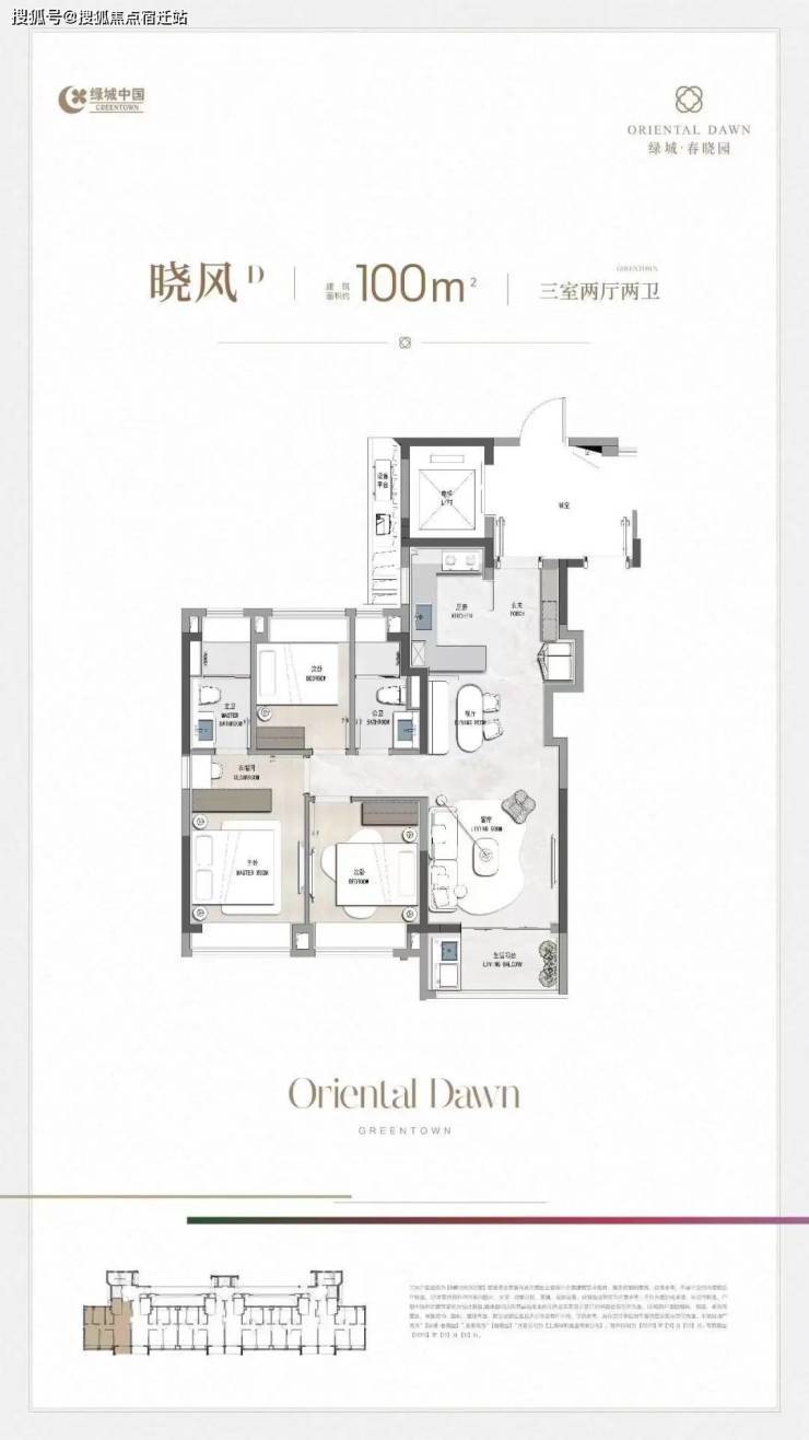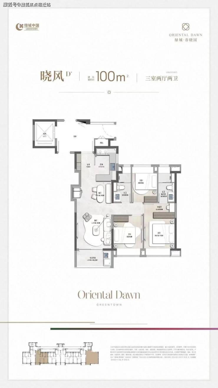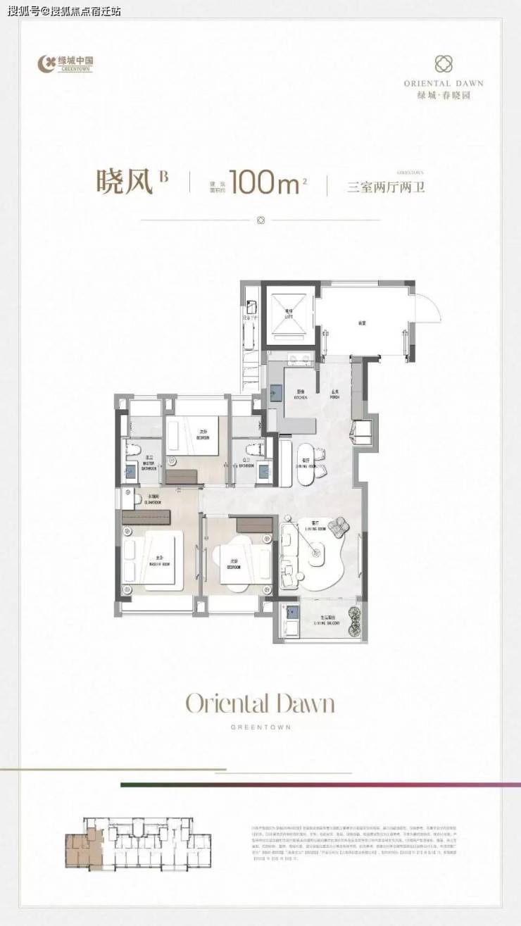 户型设计上,建面约100㎡户型,功能性做到3房2卫,适配市场主流需求。LDKB一体设计,餐客相连,衔接生活阳台,视野开阔,自由度更高;格局上做到了三开间朝南,开阔采光面带来充足日照;主卧套房设计,兼具私密性舒适度。