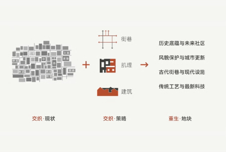 通过保护修缮、保留改造、更新改建三大更新手法,萃取打造「江南园邸」、「近代中西合璧」、「近代装饰艺术」、「现代主义」四大建筑风格。