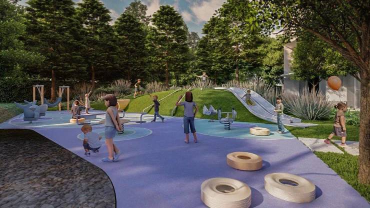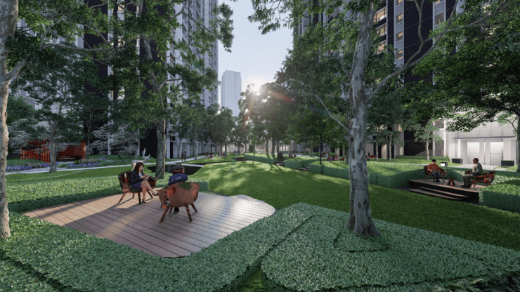 在活动大草坪上互动,其中有专属儿童乐园,景观中还保留了一些休闲平台和户外凉亭可供家长看护孩子,打造住宅花园城市中的平静绿洲,塑造与大自然的互动体验。